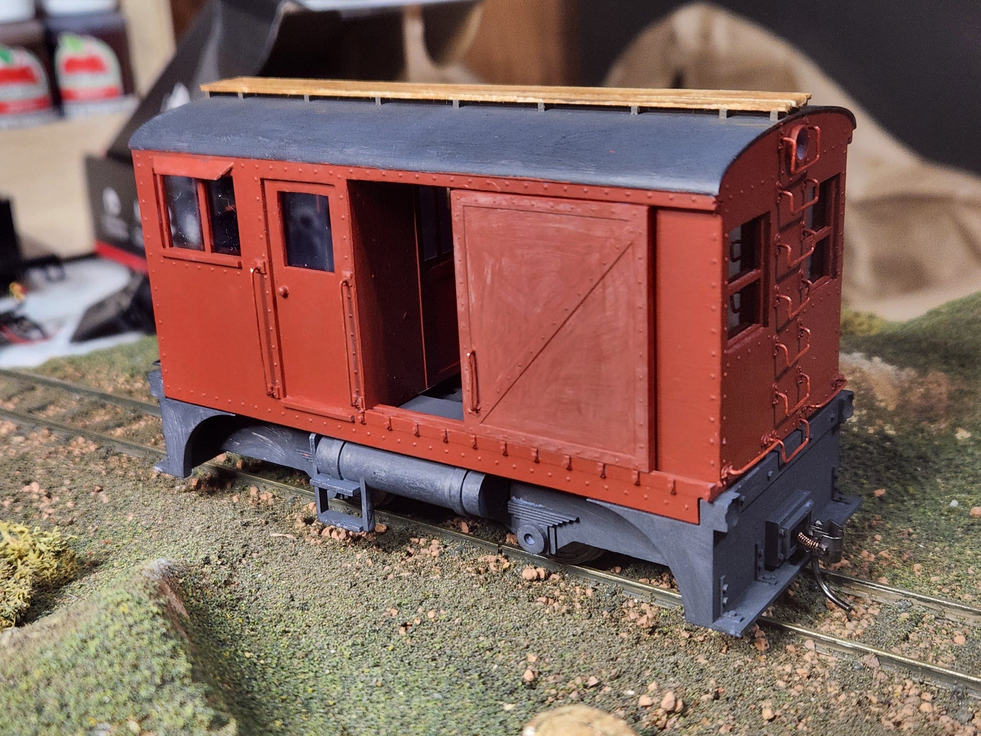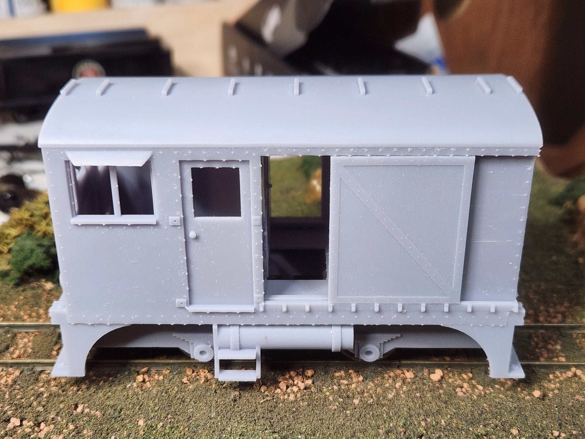 This is an On30 freelance box cab switcher kit runs double duty. It is set up with sliding doors for moving mail or small loads of freight and couplers for switching freight cars. It is 3D printed in Resin. It is designed to operate on the Bachmann On30 Streetcar chassis with Kadee #22 couplers. This kit consists of 7 individual parts as well as a piece of .02" plexiglass for windows, hobby wood for the roof walk and .020" wire for grab irons.